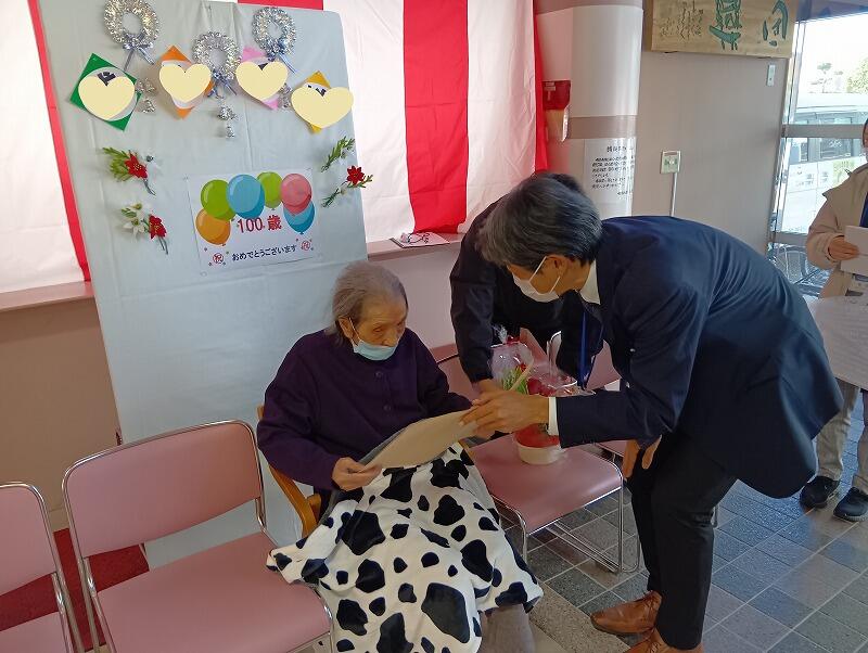 本日、諫早市より百歳になられた利用者様に